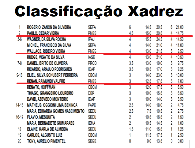 Brilhante organização da SECRETARIA DE ESPORTES (SESPORT) e com apoio da ARCADE ESPORTES, CLUBE RECREATIVO XADREZ CAPIXABA e LIGA BRASILEIRA DE XADREZ.